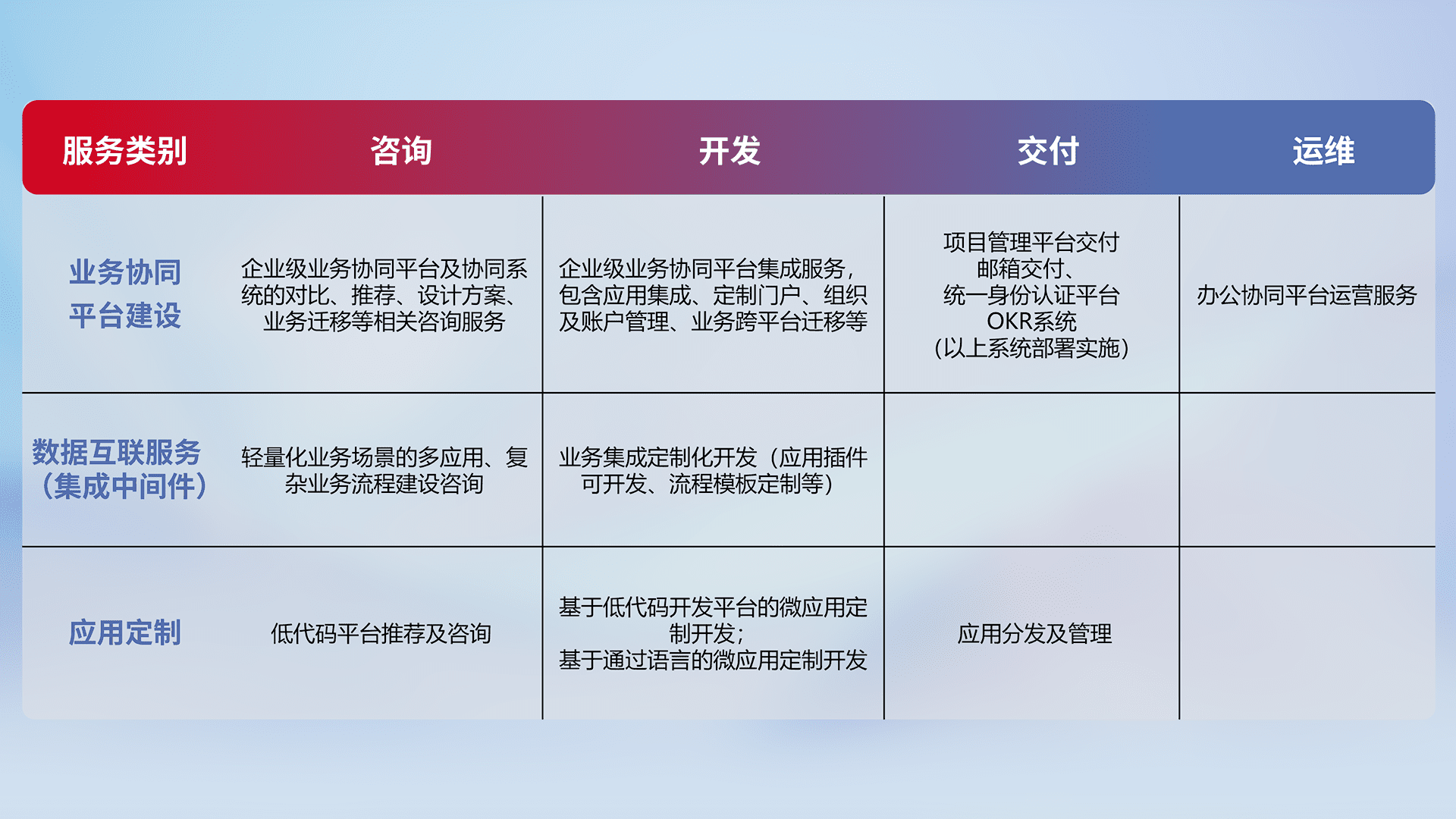 针对钉钉、、、、企微、、IDaas等平台级产品提供产品的规划、、、、方案、、、交付、、、定制化开发等服务,,实现如统一协同办公、、智能客户服务、、、混合会议管理、、智能数据查询、、、等业务场景,,,实现数字化转型。。。。